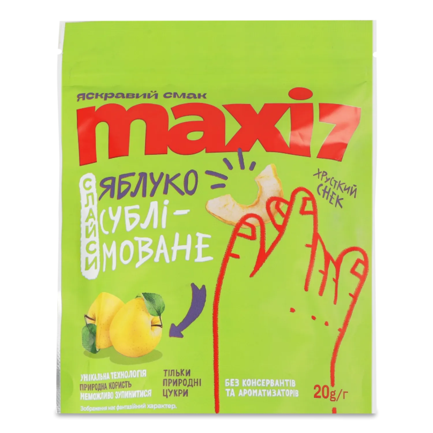 Склад: 100% слайси яблука, висушені методом вакуум-сублімаційної сушки. Може містити сліди морепродуктів, молочних продуктів та глютену.