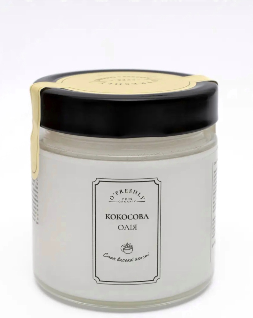 100% натуральна кокосова олія, виготовлена з висушеної м’якоті кокосового горіха. Багате джерело здорових жирів, переважно середньоланцюжкових тригліцеридів (МСТ), які підвищують енергію та підтримують загальне здоров’я. Має антиоксидантні властивості, допомагає захищати клітини від окислювального стресу та покращує засвоєння поживних речовин із їжі. Містить вітаміни E та K, залізо та інші мікроелементи.
