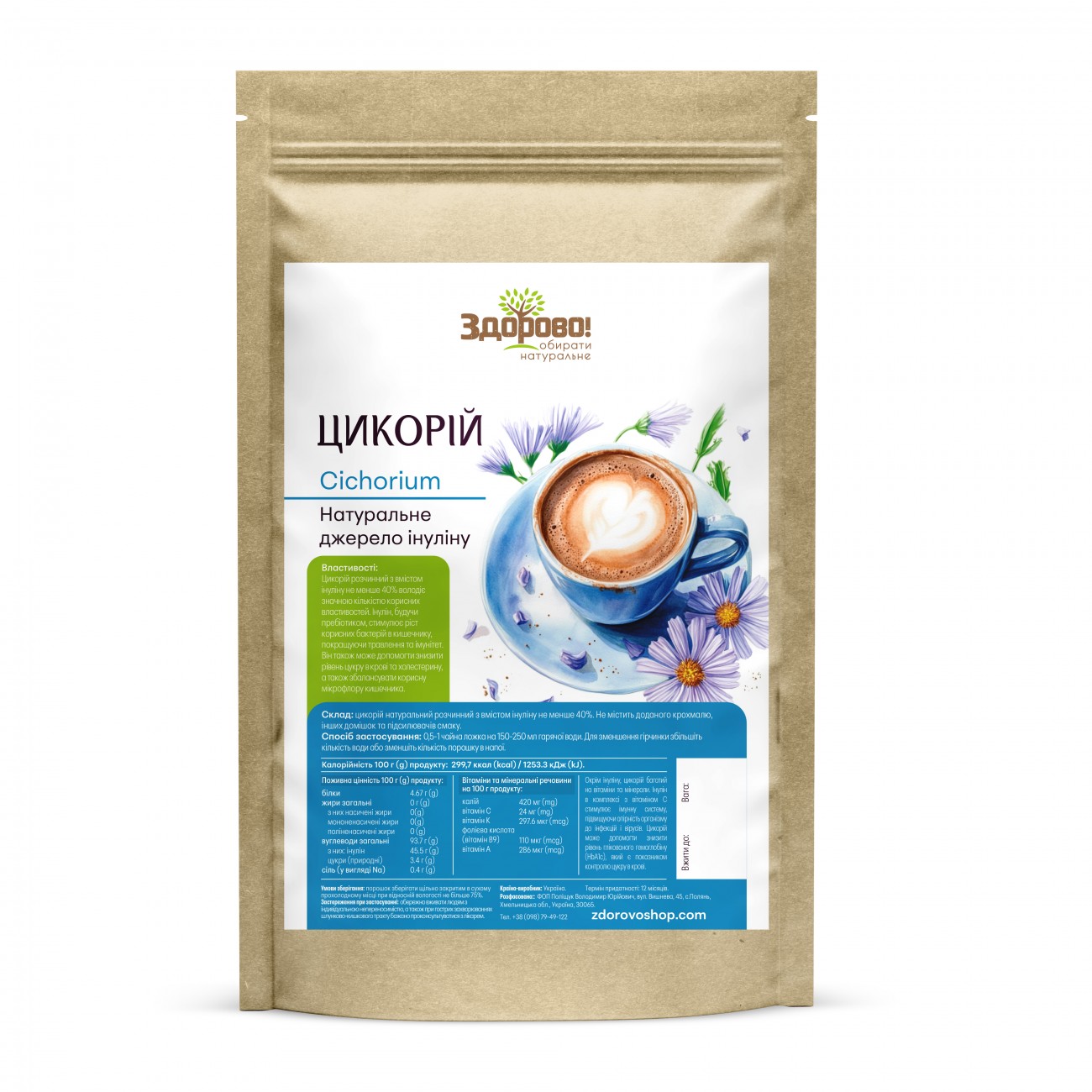 Склад: натуральний розчинний цикорій із вмістом інуліну ≥40%, без доданого крохмалю, ароматизаторів та підсилювачів смаку.